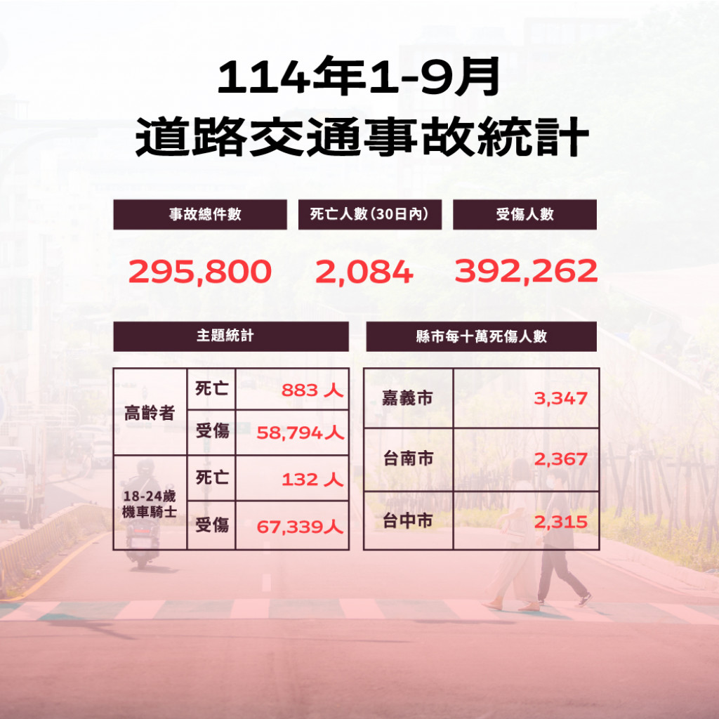 本縣114年1-9月道路交通事故死傷累計23,418人,請貴單位及所屬機關運用既有宣傳通路協助加強宣導,共同降低死傷人數。