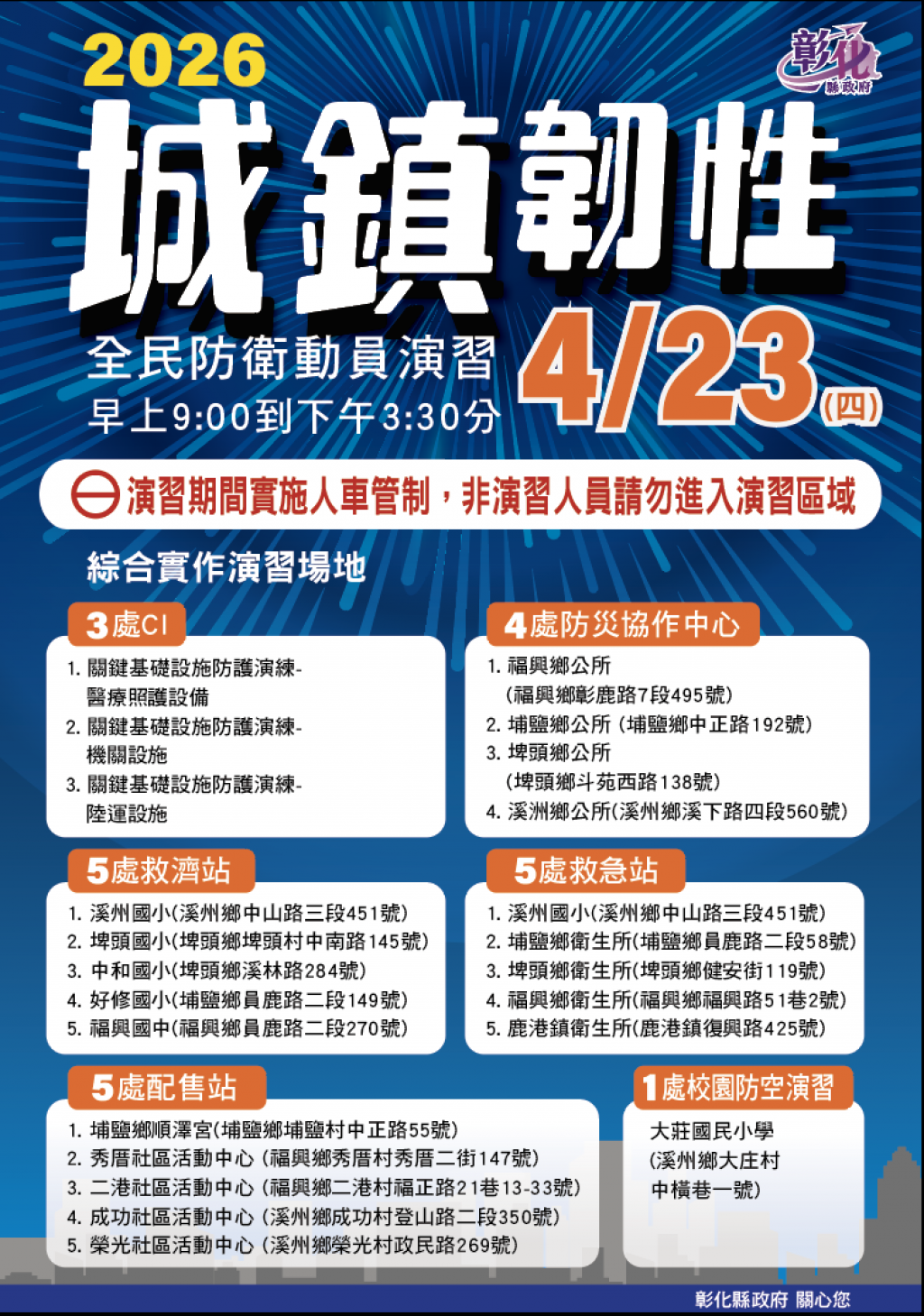 | (一) | 文字宣傳內容如下:彰化縣政府謹訂於115年4月23日(星期四)於福興鄉、埔鹽鄉、埤頭鄉、溪州鄉等4個鄉(鎮、市)辦理彰化縣2026城鎮韌性(全民防衛動員)演習。 |